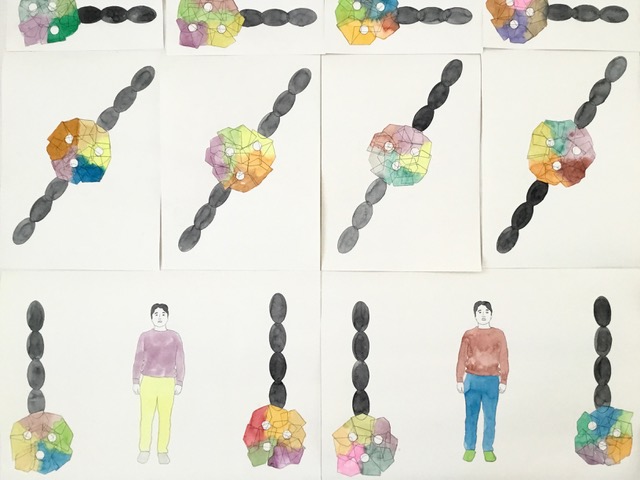 Das Platzieren eines Objektes im Raum ist ein performativer Akt, den der Künstler mithilfe von Schablonen und Aquarellfarben in eine zweidimensionale Darstellung überträgt. So wird das klassische Sujet des Stilllebens um die ihm vorausgehende Handlung erweitert: das Arrangieren der Objekte. Diese Aktion hinterlässt auf Akatsuki Oguras Bildern eine Spur, indem die Abfolge der Bewegungen der handelnden Person sichtbar wird. Eine Figur erscheint in verschiedenen Phasen einer Bewegung, die im Moment ihrer Darstellung bereits vergangen ist. Im Bild überlagern und verdichten sich diese Zeitebenen; als Speicher der Erinnerung fixiert es den vergangenen Moment und wird für den Betrachter in diesem Sinn zu einem Still-Leben.